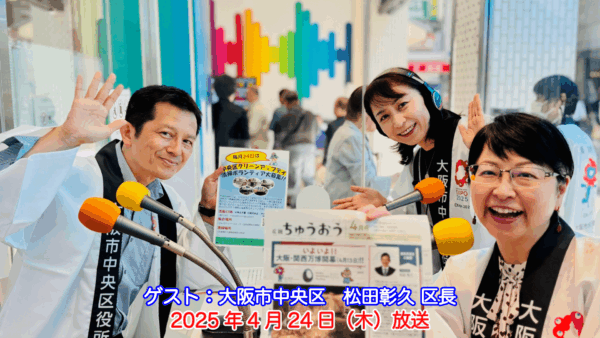 2025年4月24日、『ミナミ de おおきに』「大阪市中央区 ゆめまるくんインフォメーション」📻 4月より大阪市中央区の新区長として就任された松田彰久(まつだあきひさ)様にお越しいただきました! これまでのお仕事のお話、区長に公募されたきっかけや、中央区クリーンアップデイ、そしてこれからの中央区についていろいろお話しいただきました。 ・区長プロフィールはこちら ・ご出演時の様子はこちら