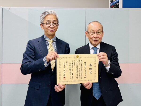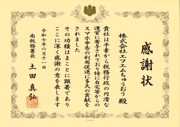 2025年6月11日、税務行政の円滑な運営への寄与、特に自宅等からのスマホ申告の利用促進に多大の貢献をしたことへの感謝の意として、南税務署さまより感謝状が贈られました! 同年2月13日には、南税務署の署長 土田 様・総括上席 河瀬 様が生放送番組「ミナミ de おおきに」にご出演🎙 確定申告に関する情報や、国税電子申告・納税システム「e-Tax」、マイナポータルサイトの利便性、チャットボット「ふたば」などについてご紹介いただきました。